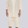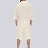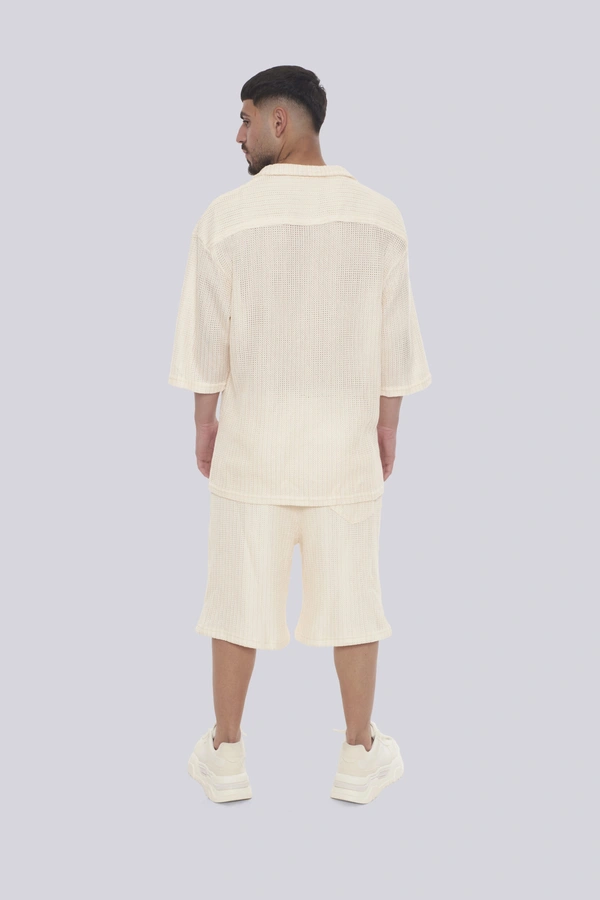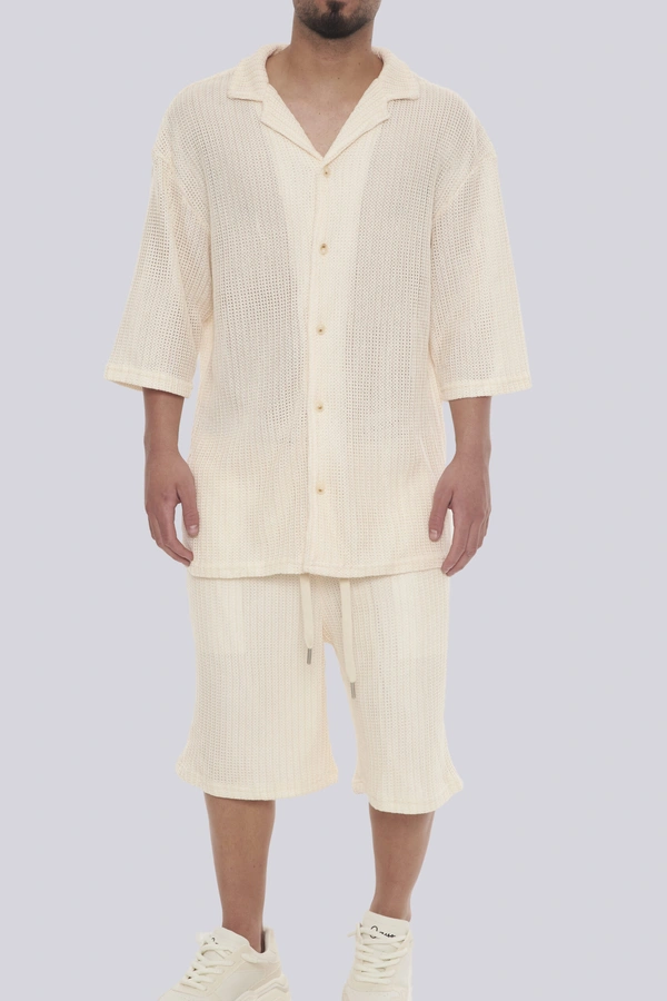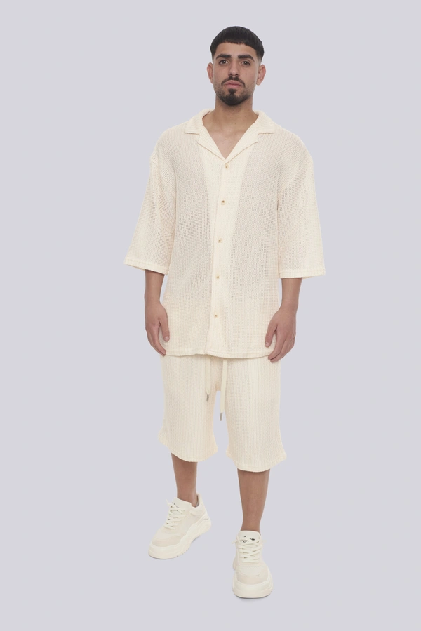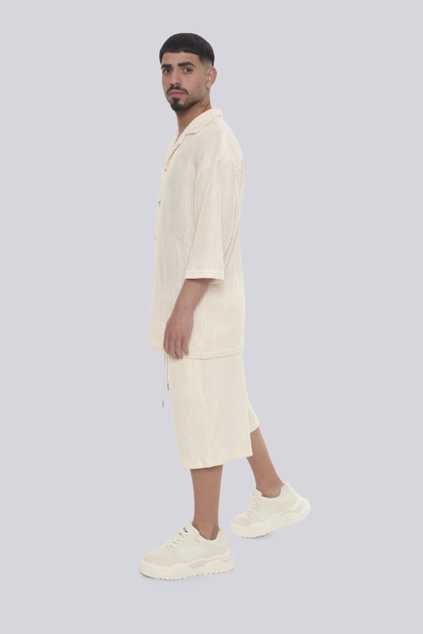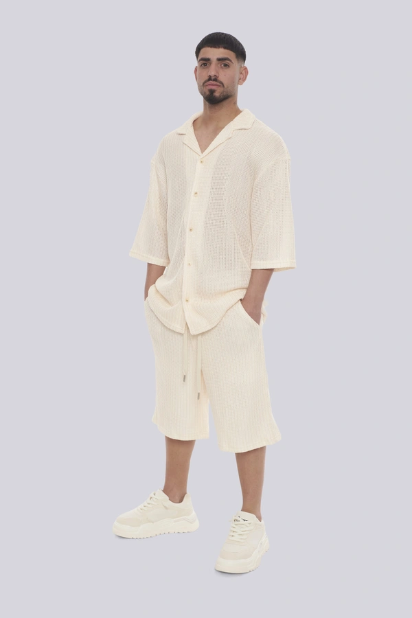 הכירו את סט רודוס CREAM מבית GOCHA – השילוב המושלם בין סטייל אורבני גבוה לנוחות מקסימלית. הסט כולל חולצה מכופתרת ומכנסיים קצרים בגוון קרם (אוף-ווייט) נקי, העשויים מבד סרוג בטקסטורת ריב (Ribbed) עם פסים אנכיים בולטים למראה יוקרתי ומתוחכם. גזרת האוברסייז (Oversize) המשוחררת מבטיחה אוורור וחופש תנועה, בעוד צווארון הוי הפתוח והשרוולים הרחבים מעניקים טאץ של פנאי יוקרתי. המכנסיים מצוידים במותן אלסטית ושרוך הידוק להתאמה אישית. זהו פריט חובה לגבר ולנער המחפשים מראה טרנדי ונינוח לבילויים, לחופשות או לשעות הפנאי, המשלב איכות ללא פשרות עם עיצוב בינלאומי.