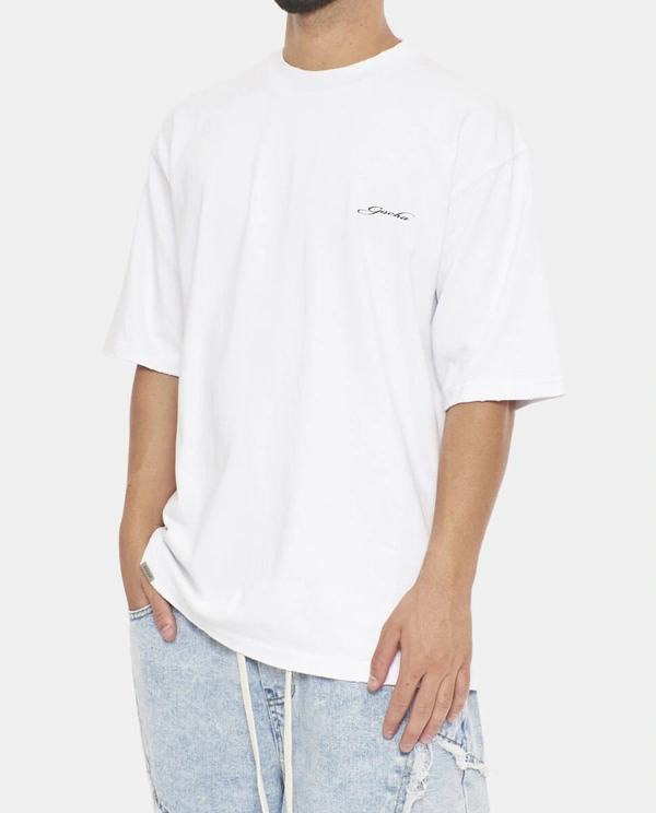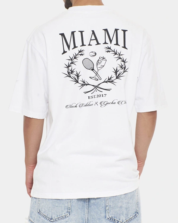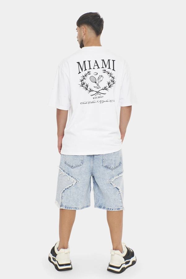 חולצת טי שירט אוברסייז קצרה MIAMI WHITE לגברים מבית GOCHA. לוק קליל וטרנדי עם הדפס גב ייחודי.