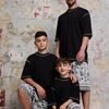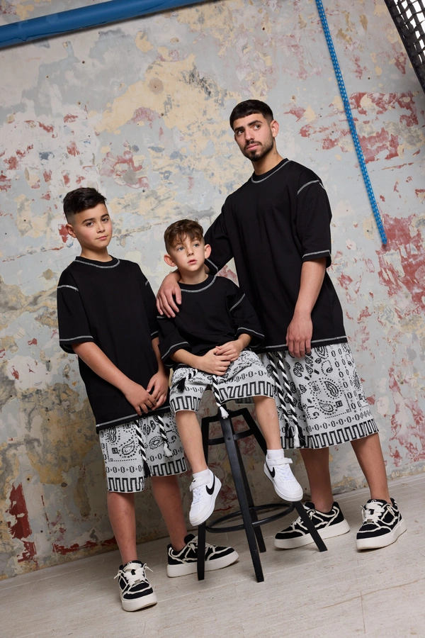 הסט UP-DOWN BLACK מבית GOCHA הוא פריט חובה לכל חובב סטריטוור שמחפש שילוב בין נוחות מקסימלית לסטייל בועט. הסט כולל חולצת טי בגזרת אוברסייז נינוחה בגוון שחור עמוק, המודגשת באמצעות תפרים לבנים קונטרסטיים בצווארון ובמכפלות המעניקים מראה מודרני וייחודי. המכנסיים הקצרים התואמים מציגים הדפס פייזלי (בנדנה) ודוגמאות גיאומטריות בשחור-לבן, עם שרוך קשירה עבה להתאמה אישית. הבד מרגיש כסריג כותנה איכותי ועבה, המבטיח עמידות ונראות יוקרתית. זהו הפתרון המושלם למראה יומיומי משודרג, בילוי עם חברים או יצירת הופעה משפחתית אופנתית ומלוכדת, תוך שמירה על חופש תנועה מלא ואווירה משוחררת.