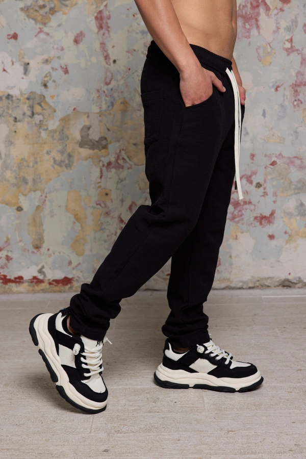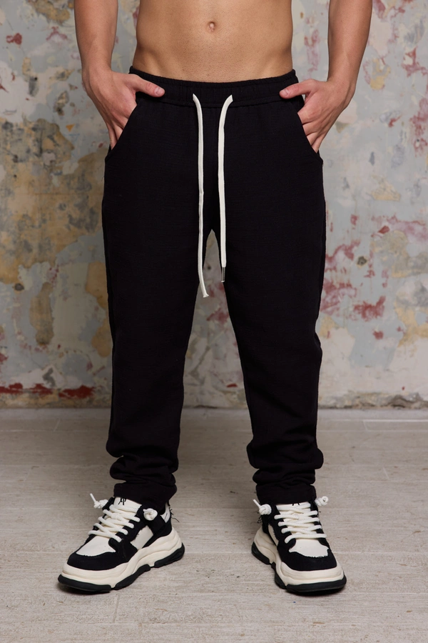 שדרג את המלתחה שלך עם מכנס פשתן ארוך מיקונוס בגוון BLACK, הפריט שמשלב בצורה מושלמת בין נוחות מקסימלית לסטייל בלתי מתפשר. המכנסיים עוצבו בגזרת גוגר נינוחה עם בד ארוג בעל טקסטורה ייחודית ומראה מקומט עדין המעניק עומק לכל לוק. הם כוללים חגורת מותן אלסטית ושרוך קשירה עבה בדוגמת פסים אלכסוניים המעניקים טאץ מודרני וניגודי למראה השחור הקלאסי. עם גזרה ישרה, סיומת מכווצת קלות בקרסול וכיסי צד פונקציונליים, מדובר בבחירה האידיאלית למראה סטריטוור יומיומי או לשעות הפנאי. המכנס מותאם במיוחד לגבר הישראלי המחפש איכות, אווריריות ומראה מוקפד שמרגיש פשוט נכון בכל סיטואציה.